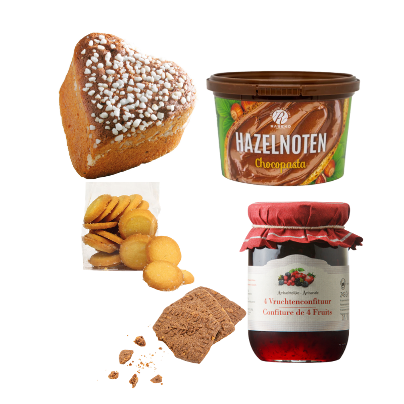 Maak je ontbijt compleet met dit knusse zoete pakket: peperkoek, krokante speculaas, fijne confituur, romige choco en een heerlijk koekje. Ideaal om samen van te genieten.